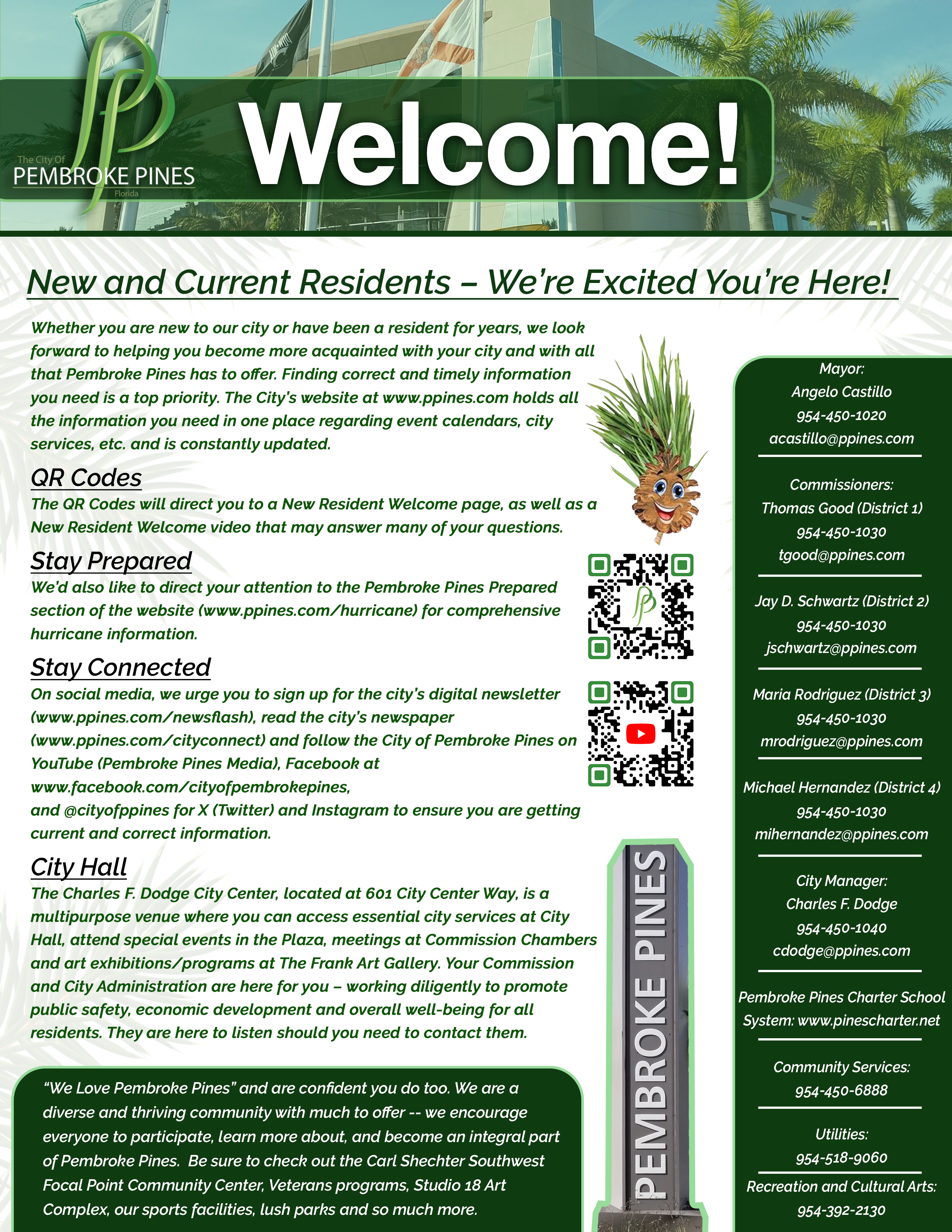As a new resident, you may be experiencing a hurricane season for the first time. We encourage all residents to always be prepared and to visit the City's "Pembroke Pines Prepared" section of this website for hurricane preparedness information, videos and resources. You may also have questions regarding your garbage or bulk pickup schedules - information can be found HERE. Also, another helpful link is SeeClickFix.com, an online web application that allows any individual to report non-emergency issues such as graffiti, potholes or traffic safety issues on a map for everyone to see. Be sure to check out our website for any information you may need -- our Pines Pal chatbot at the bottom right is incredibly helpful.