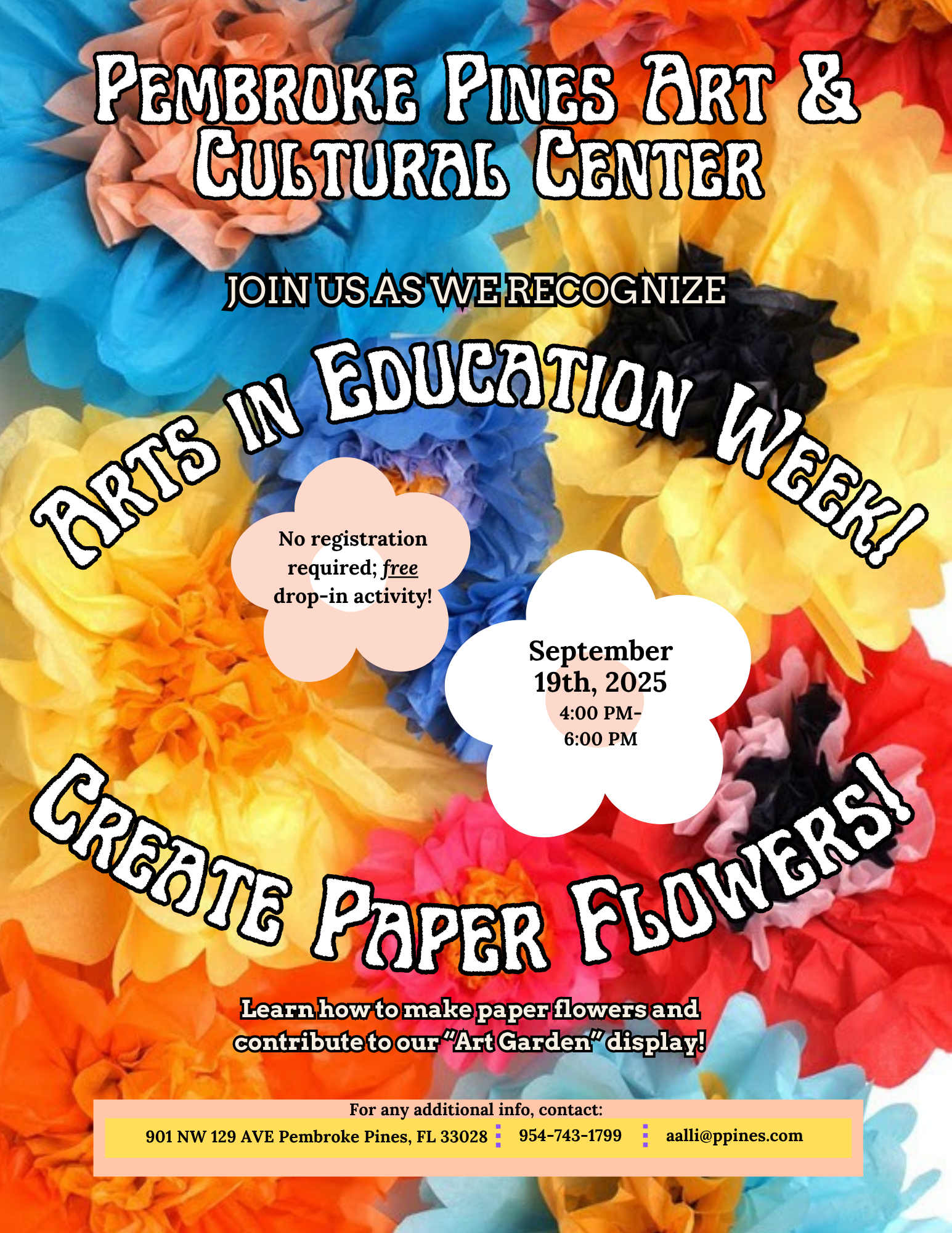 The Pembroke Pines Art and Cultural Center is located at 901 NW 129th Avenue. We offer music, art and drama classes. Open enrollment & Facility Tours going on now.