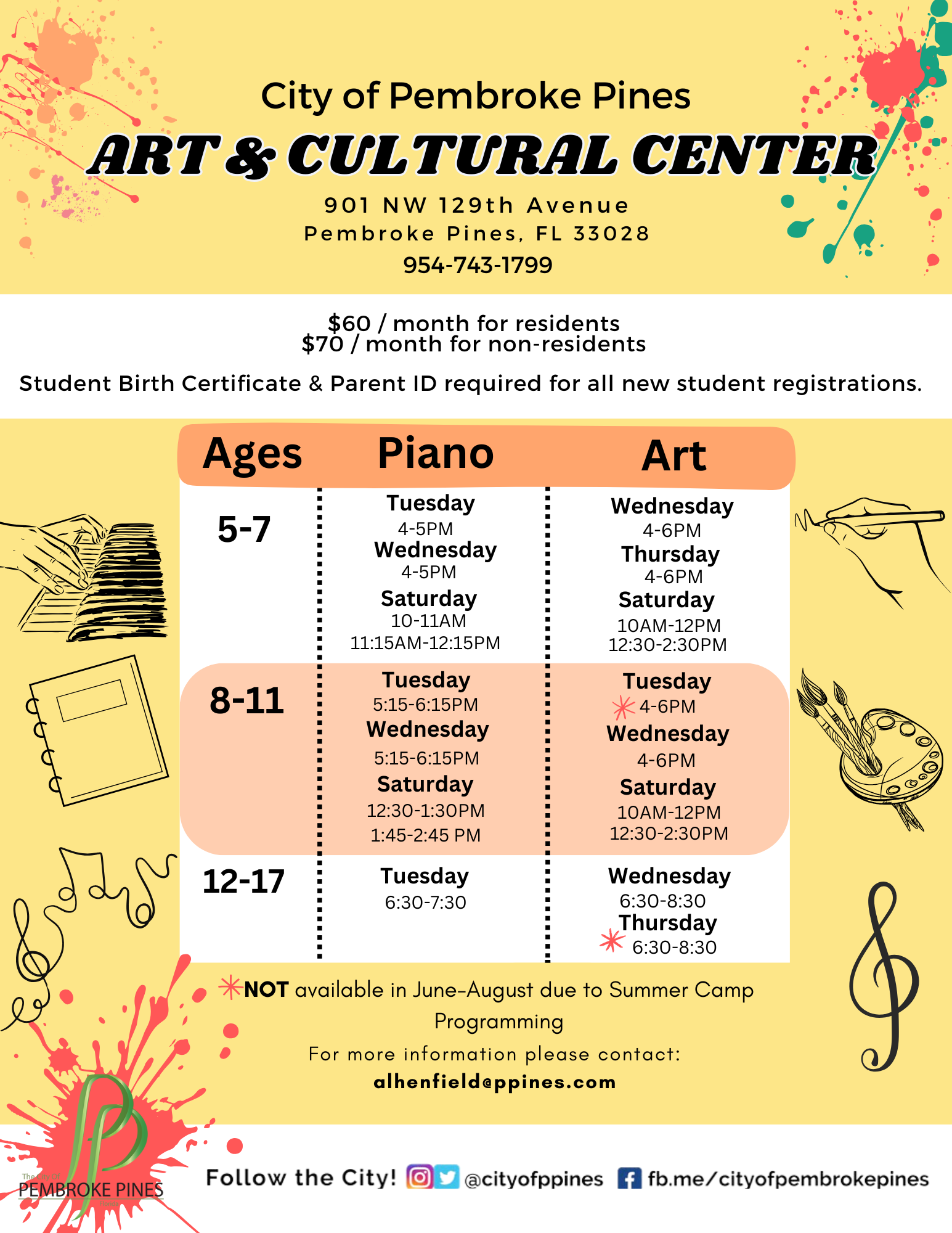 The City of Pembroke Pines offers affordable afterschool Art & Piano Classes for children ages 5-17 throughout the week! To get started, we will need your driver's license and your child's birth certificate. Contact Cultural Arts Coordinator, Alexzandria Henfield, for further assistance at alhenfield@ppines.com or call 954-743-1799!